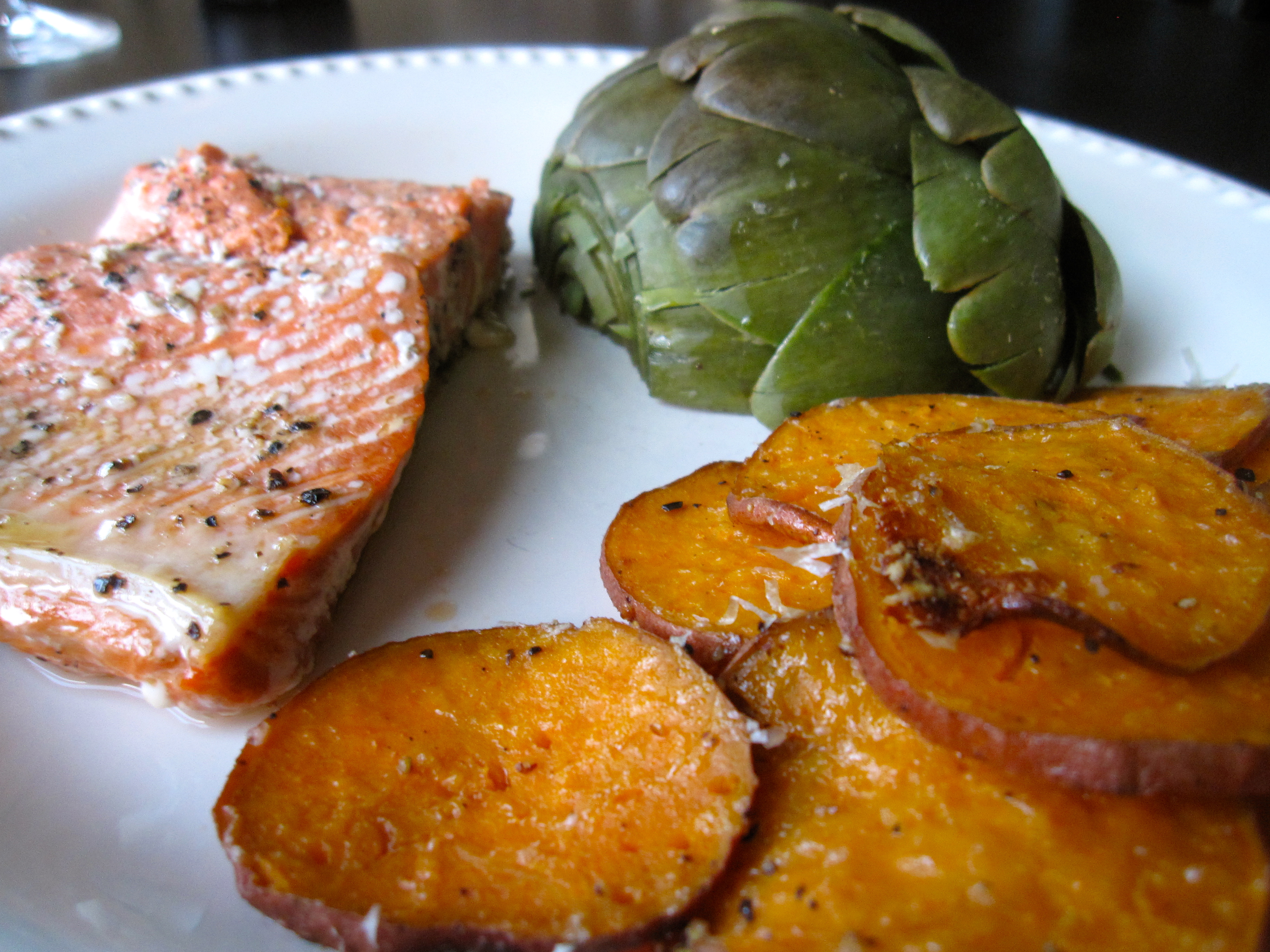 Sweet potato cut into super thin slices, tossed in olive oil, freshly cracked pepper, and salt. Baked with the salmon and finished with a sprinkling of freshly grated parmesan and a quick few minutes under the broiler. Triple deliciousness.