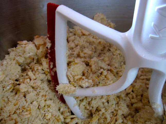 3. Add butter and oats to the bowl. Mix on low until large, moist crumbs form.