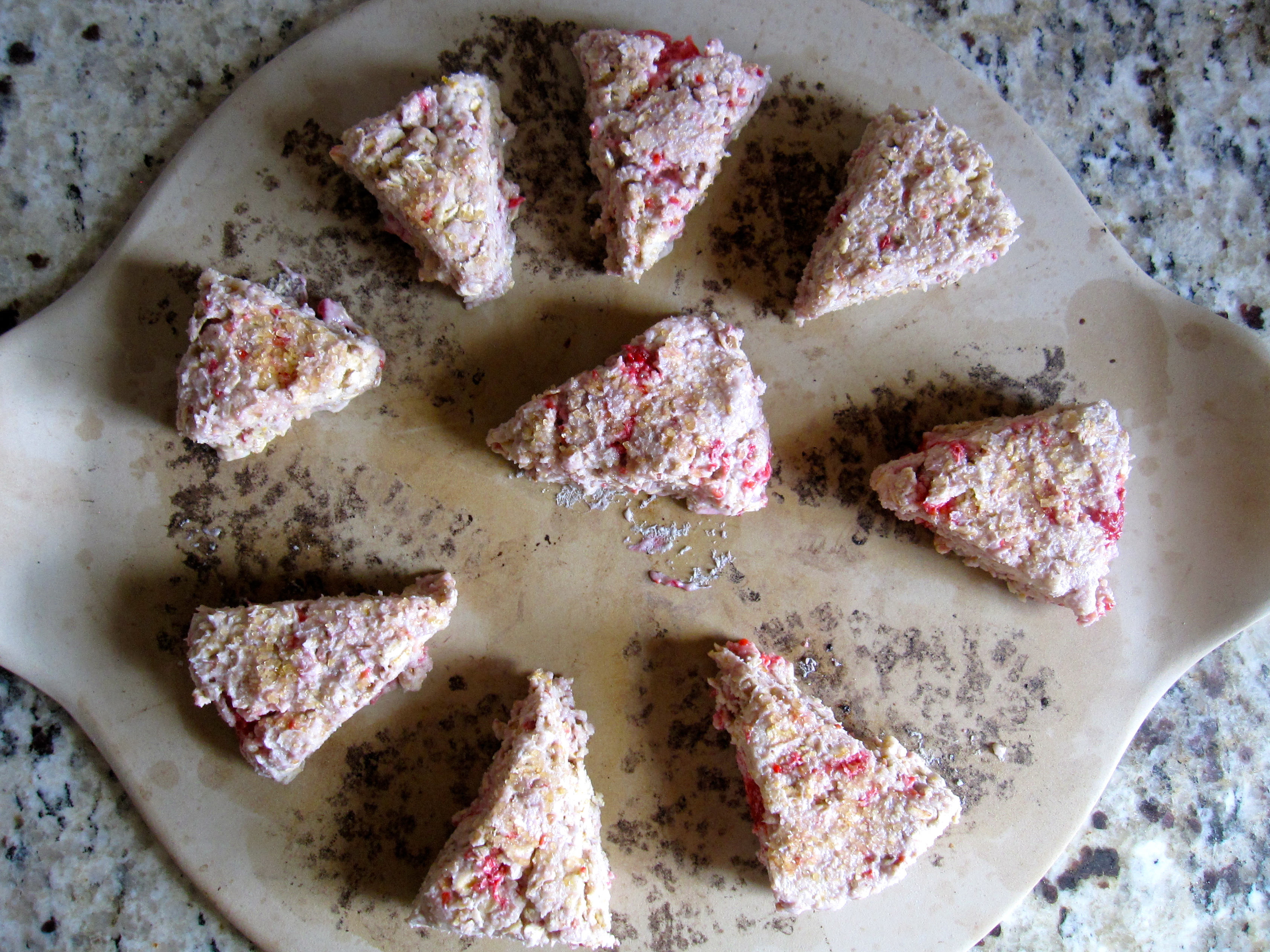 8. If you’re using a pizza or baking stone, remove it from the oven and quickly place 8 scones on the stone. Put the stone immediately in the oven to avoid the dough softening on the heated stone.