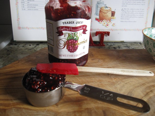 I reached into the cupboard, second one to the left of the oven, and grabbed a small cereal bowl on my way to the fridge. The jar of Knott’s Berry Farm raspberry jam sat patiently waiting for me in the door of the fridge. The illustration on the recipe page displayed tiny cookies with red and yellow tops. Raspberry jam is red! I thought. Perfect. Setting the jar on the counter, I pulled open the drawer below and grabbed a small spoon. Measuring cup, measuring cup, where’s the measuring cup? I wondered. All of a sudden I could picture mom cooking last year’s Thanksgiving dinner and I wandered over to a cupboard on the other side of the sink. Yes! I stood on my toes and reached up to the second shelf, carefully taking the glass measuring cup by its thick handle. One, two, three heaping spoonfuls of jam did the trick, and I spooned the jam from the measuring cup into the bowl, stirring until the jam was shiny and as smooth as yogurt.