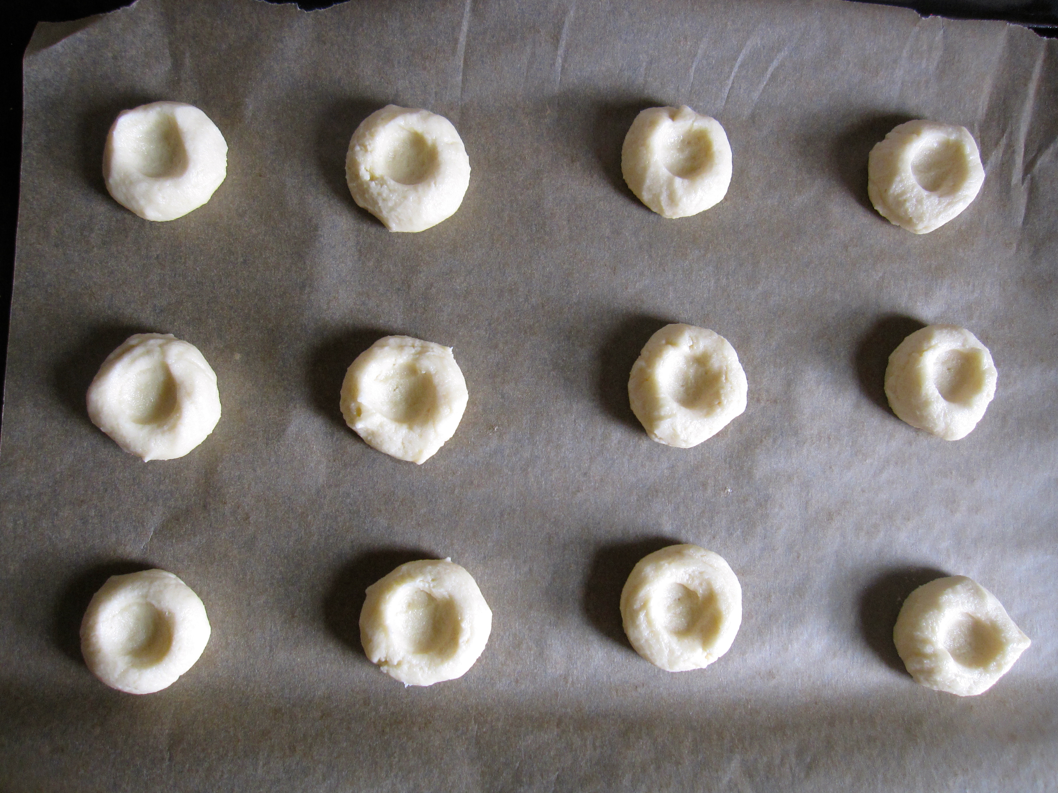 5. Pinch off bits of dough and roll into 1-inch balls. Place the balls on a baking sheet about 1 inch apart. Press your fingertip into the centre of each cookie to make a deep little “well” (the dough may crack around the edges—you can pinch it back together if you wish). Fill each well with about ¼ tsp jelly.