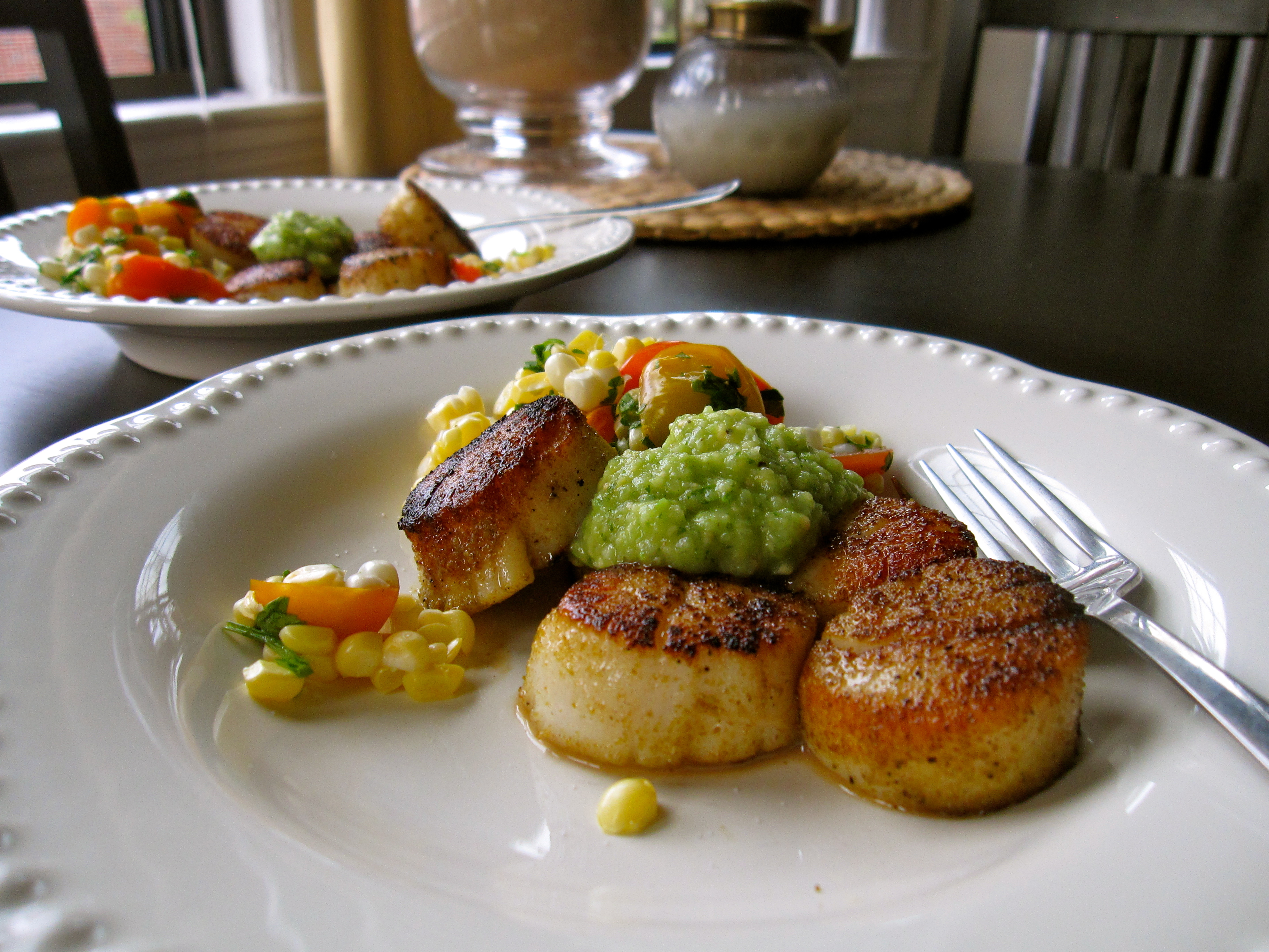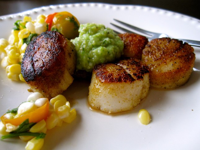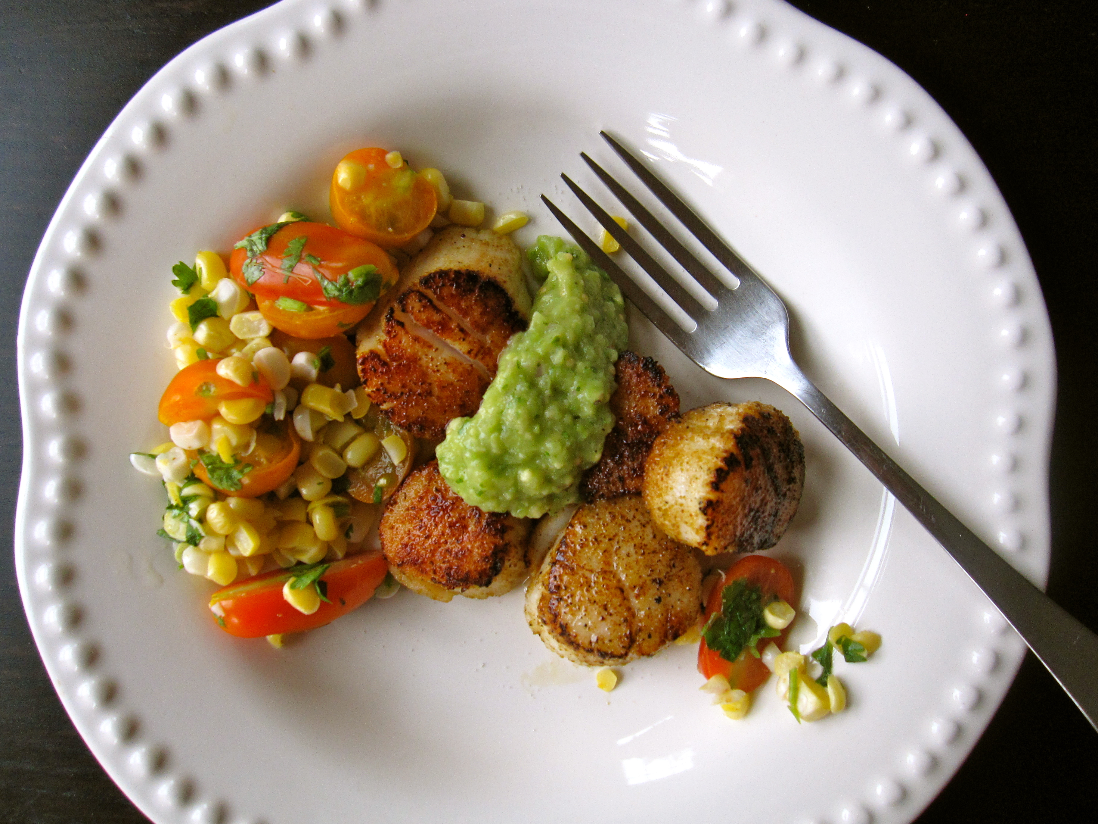 Seared Scallops with Tomatillo Guacamole and Corn Salsa